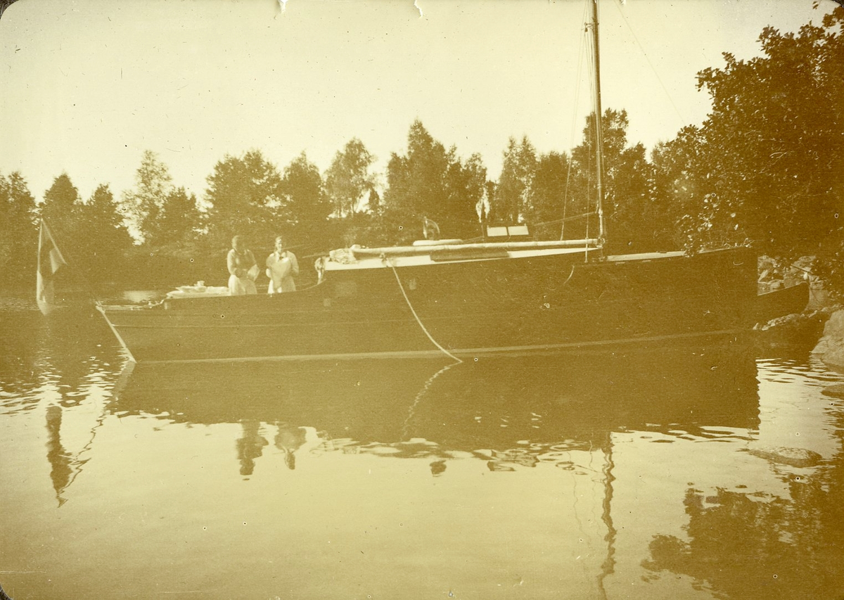 Större, ruffad, fritidsbåt vid vattenbryn. Kalmar regemente.