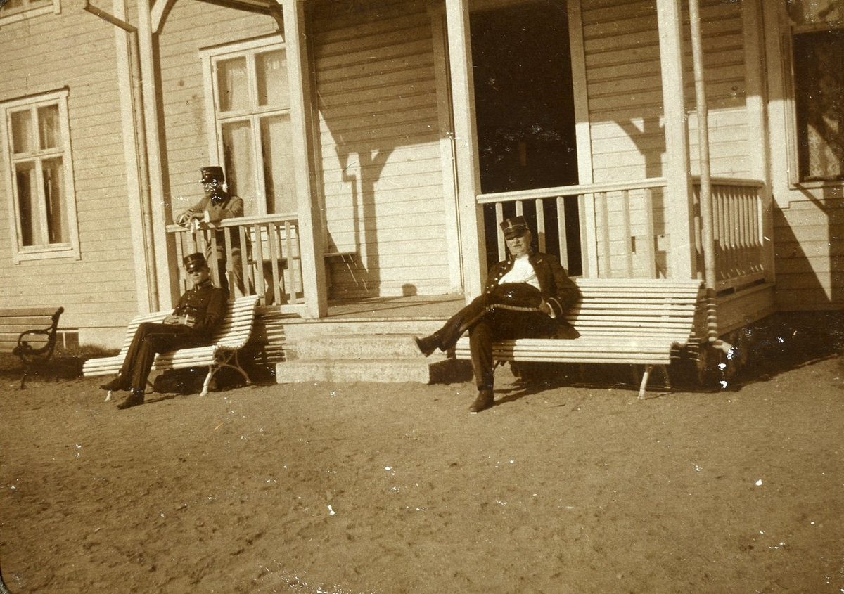 Tre oidentifierade officerare, varav den t h möjligen är auditör, i avslappnad pose. Hultsfred. Kalmar regemente.