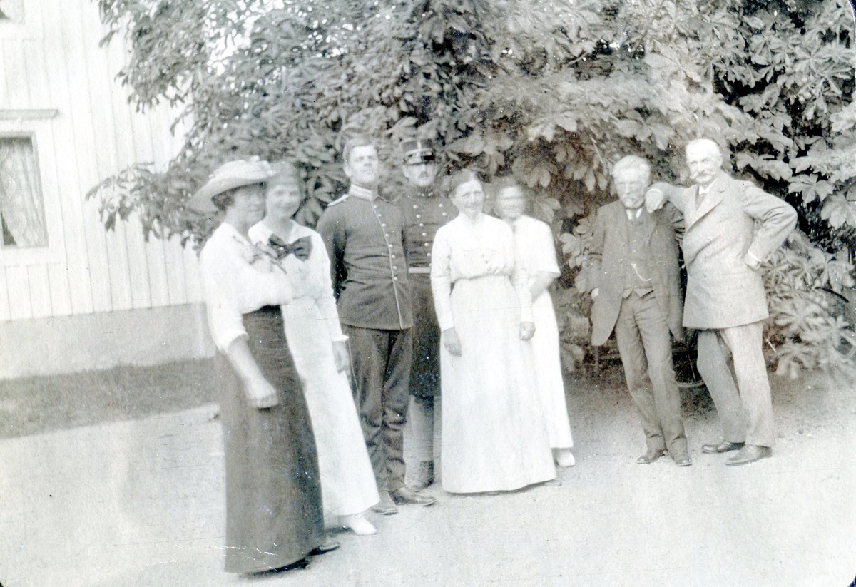 Två oidentifierade militärer tillsammans med civilklädda personer i en trädgård. Hultsfred? Kalmar regemente.