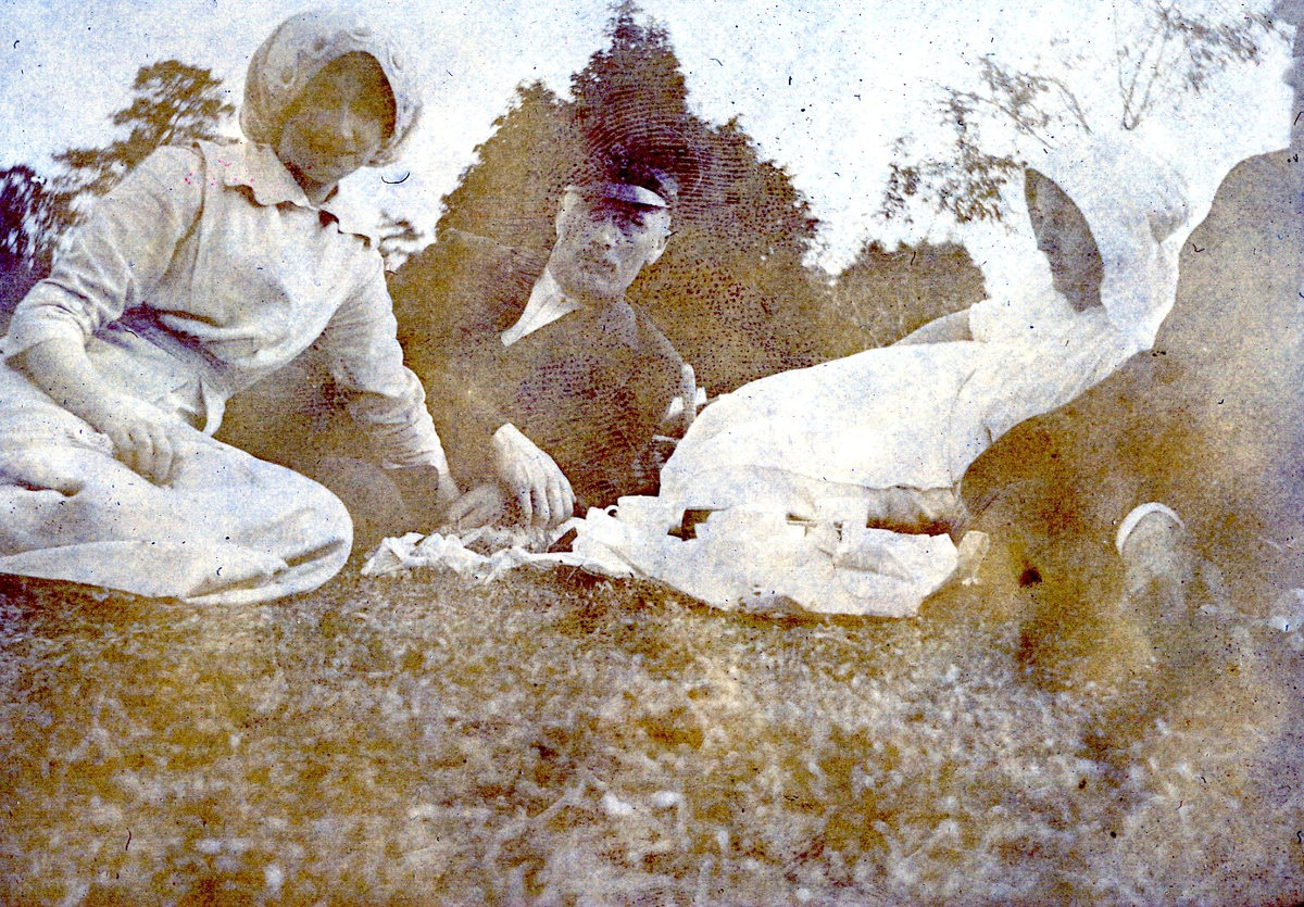 Titel: Två oidentifierade kvinnor och två män på picknick.