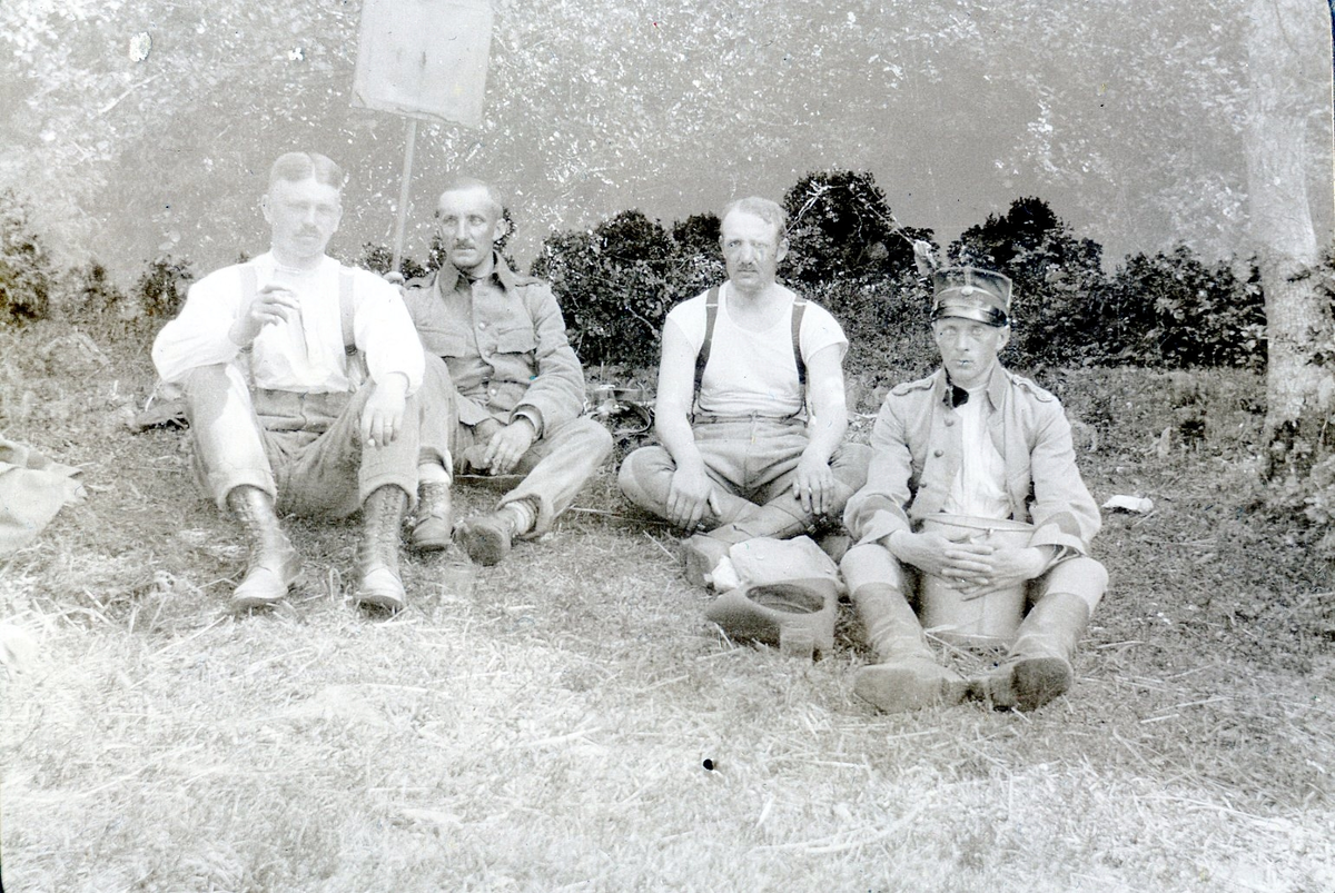 Titel: Fyra oidentifierade officerare vilar på marken. Öland? Kalmar regemente.