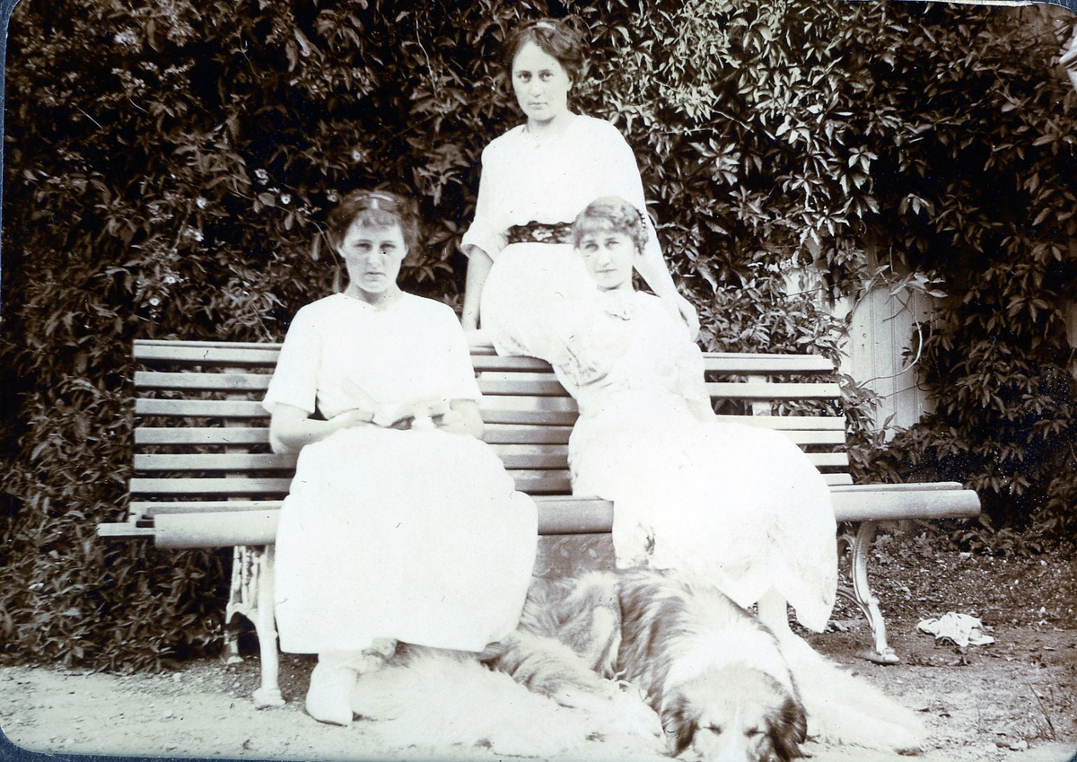 Titel: Tre oidentifierade kvinnor på trädgårdssoffa samt en liggande hund på marken.