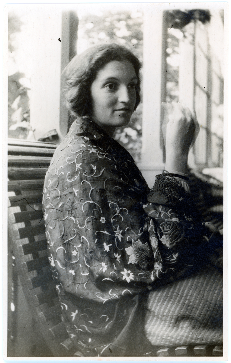 Porträtt av Anna-Lisa Mannheimer-Lunn, en av Bohus Sticknings första formgivare. Anna-Lisa sitter på en bänk på en veranda med fönster. on bär en rock sydd av broderat kinesiskt siden.