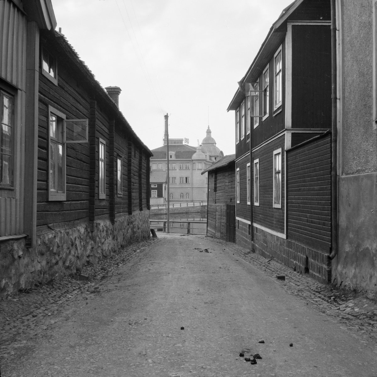 Titel: Falun, Västra Hamngatan mot badhuset från Hälsingtorget.