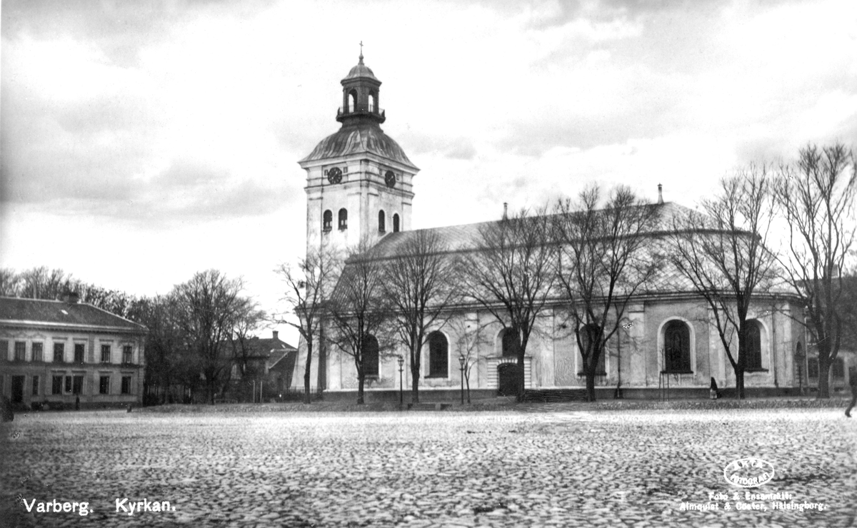 Vykort, "Varberg. Kyrkan." Byggnaden vid Kungsgatan uppfördes på 1700-talet och kallas efter sin dåvarande ägare för Lundquistska huset. I förgrunden torgets kullerstensyta.