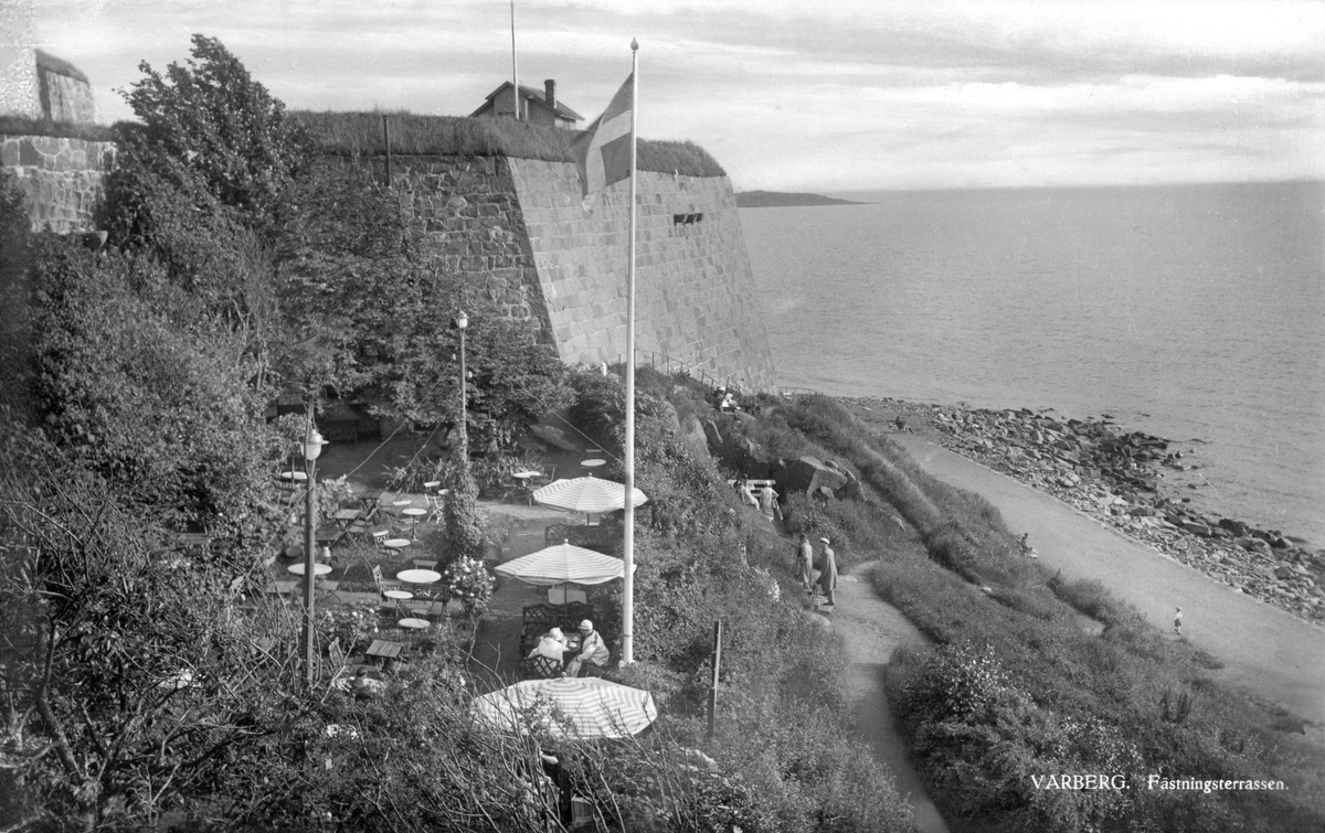 Vykort, "Varberg. Fästningsterrassen." Vy ned över kaféet och Strandpromenaden söderut. Endast två kvinnor gästar kaféet, som har tre randiga parasoll uppfällda. Ytterligare personer är på väg upp för trappan.