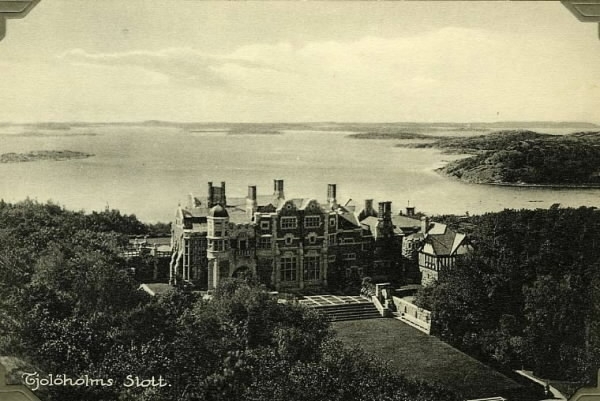 Vykort, "Tjolöholms slott". Vy över slott och slottspark mot Torkelskär och andra skär i Kungsbackafjorden.