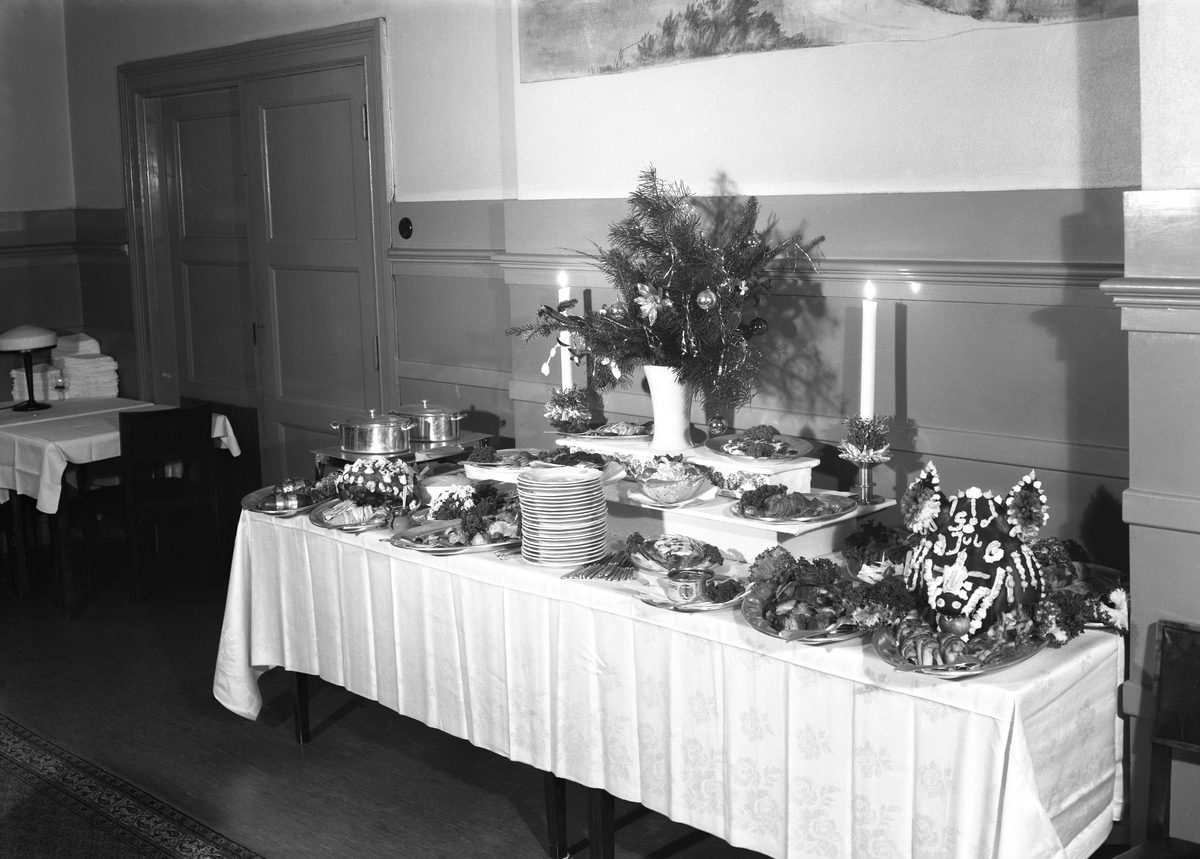 Jul på Källaren Munken, Stadshotellets "bakficka" i Varberg. Bild 1: Julbord med garnerat grishuvud närmast i bild, men även revbensspjäll, ansjovis i burk, tunga, rullsylta, julskinka och mycket annat. Bild 2: Två kvinnor ur personalen vid matsalens julgran. I det bakre utrymmet skymtar kakelugn och väggmålning.