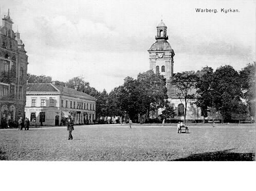 Vykort, "Warbergs kyrka" som ligger i norra änden av torget. Fastigheten som ligger i hörnet av Kungsgatan-Torggatan, kv Brunnsparken, kallas Lundquistska huset och till vänster skymtar Stadshuset och Stadshotellet från 1902.