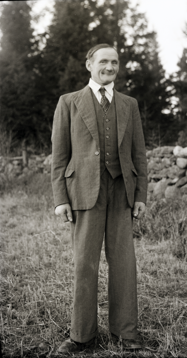 Emanuel Svensson på Dämmarehult i finkläder utomhus. Han var far till "Gösta på Fridhem".