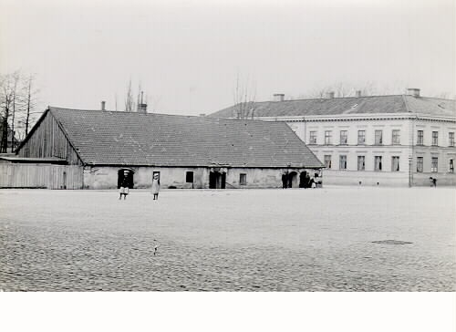 "Augusts källare" med August Anderssons smör och ostaffär längst till höger. Till vänster ligger Stina Hanssons charkuteri. Byggnaden till höger är det så kallade Lundquistska huset i kv Brunnsparken. Några personer befinner sig vid August källare" och på torget ses två barn. 1890-tal.
