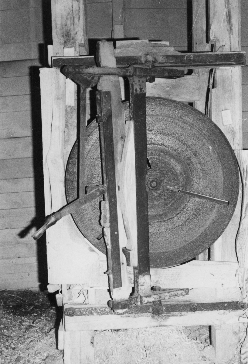 Interiör från Stegareds tunnbinderi. Hyvel för fasning av tunnstavar. August Svensson, nämndeman och jordbrukare, startade en liten industri av dritteltillverkning i Stegared vid sågen i Mjällsjöbäcksfallet. Från 1913 fanns här även en turbin för elkraft. Efter August död på 1930-talet tog sonen Artur Svensson över och fortsatte rörelsen till 1965. Industrin sysselsatte 5-6 arbetare. Man tillverkade drittlar av bok för lagring av smör åt mejerierna fram till 1950-talet. Anläggningens intagskanal rinner i en ränna av huggen natursten, som vid turbinintaget övergår i en betongkonstruktion. På husgrunden efter drittelfabriken uppfördes ett bostadshus i timmer. (Se även bild VMF031965:a-b samt samt VMA12342_1-16).