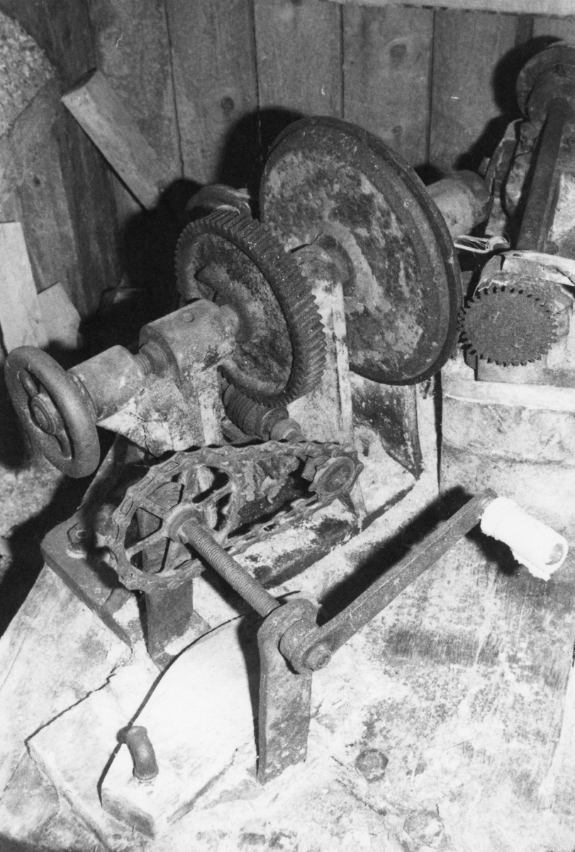 Interiör från Stegareds tunnbinderi. Maskin för fasning av lock och botten. Bild 3 visar en detalj. August Svensson, nämndeman och jordbrukare, startade en liten industri av dritteltillverkning i Stegared vid sågen i Mjällsjöbäcksfallet. Från 1913 fanns här även en turbin för elkraft. Efter August död på 1930-talet tog sonen Artur Svensson över och fortsatte rörelsen till 1965. Industrin sysselsatte 5-6 arbetare. Man tillverkade drittlar av bok för lagring av smör åt mejerierna fram till 1950-talet. Anläggningens intagskanal rinner i en ränna av huggen natursten, som vid turbinintaget övergår i en betongkonstruktion. På husgrunden efter drittelfabriken uppfördes ett bostadshus i timmer. (Se även bild VMF031965:a-b samt samt VMA12342_1-16).