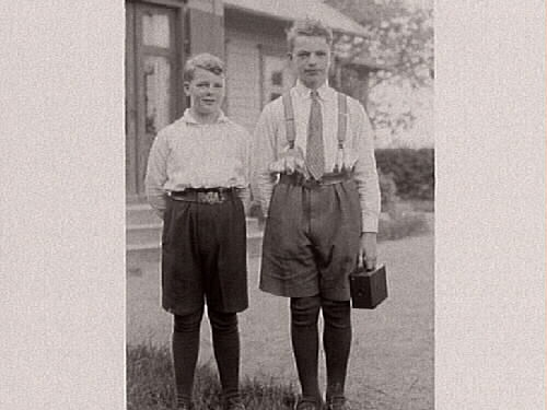 Bröderna (från vänster) Lennart och Tore Winqvist, söner till Amelie och Johan Winqvist, fotograferade utomhus. Tore håller i en lådkamera. Huset ligger vid Fastarpsvägen i Tvååker.