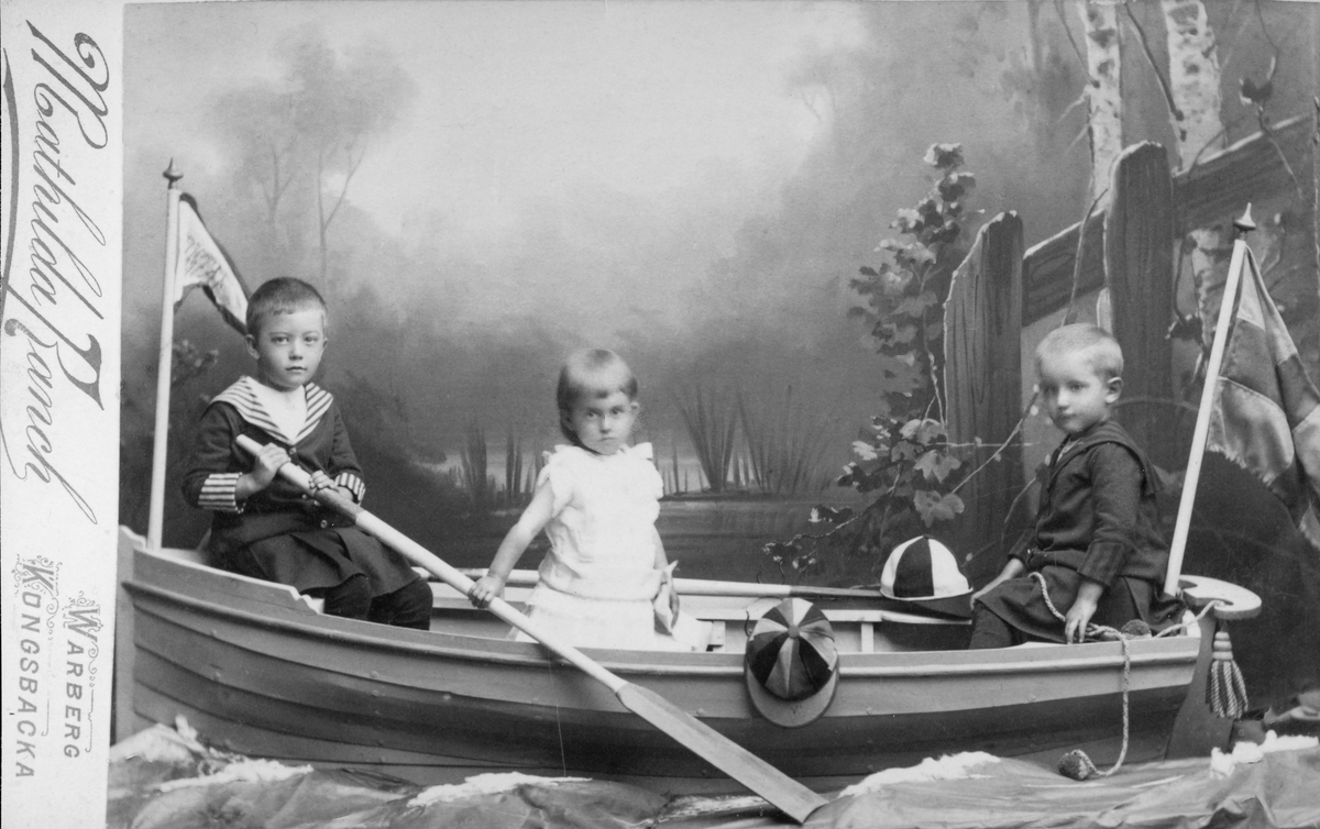Ateljéfoto med tre små barn sittande i en roddbåt med vimpel i fören och flagga i aktern. Två randiga kepsar ligger på relingen. Fotografen har draperat golvet så det ska likna skummande vågor. Barnen kan vara relaterade till Janne Strömberg (1818-1904), stadskassör i Varberg, och hans hustru Sofie f. Ahlström.