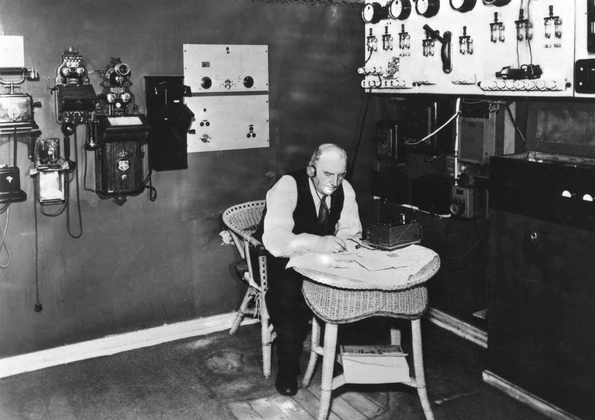 Montör och maskinföreståndare Kruse Johansson vid Varbergs Rundradiostation. Varbergs Radioklubb startades 1925, samma år som Sveriges nationella radiosändningar startades, och var jämte Falun de första lokala stationerna i landet. Sändningarna började i regel klockan 18-19 och pågick till 22-22:30. Varbergs rundradioverksamhet startade med en provisorisk sändare i Yngeredsfors Kraft AB:s ångreservstations lokaler på Hamnvägen. Därefter flyttade man till Stadshuset vid torget, varifrån de första lokala programmen sändes, och därpå flyttade radioklubben in på Tullhusets vindsvåning. 1931 gavs föreningen där betydligt större utrymme. Meddela gärna oss om du vet var denna bild är tagen!