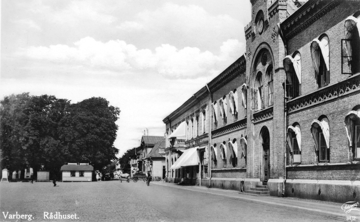 Vykort, "Varberg. Rådhuset." Bortanför rådhuset ligger apotekshuset, där fönstren står på vid gavel. Tvärs över Drottninggatan står ett hästekipage. Längs kyrkotomten står en telefonautomat och ett par bodar. På vykortets baksida finns en rund logo med en luftballong och under den står K.S.A.K. (Se även bildnr D141.)