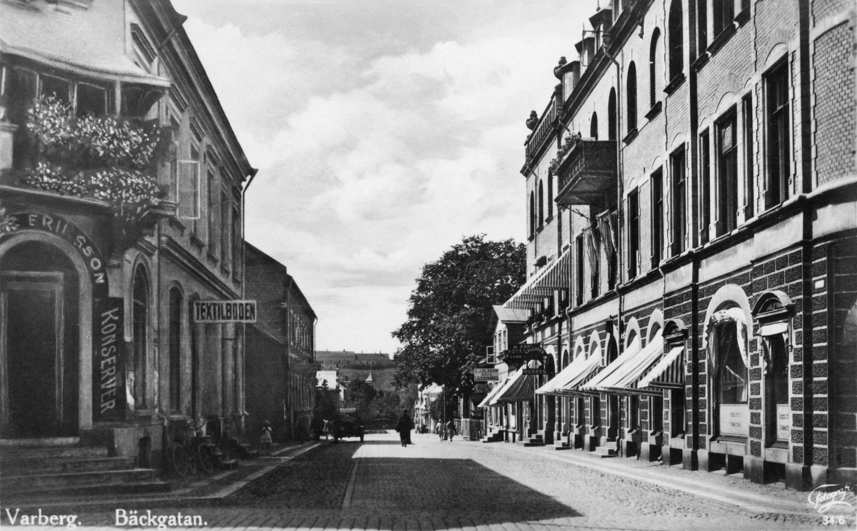 På hörnan till huset i kv Gästgivaren till vänster ligger entrén till Erikssons butik, som skyltar för konserver, och längre ner ses Textilboden. Längs gatan ses tre olika färdmedel: cykel, bil och häst. I fonden Varbergs fästning.