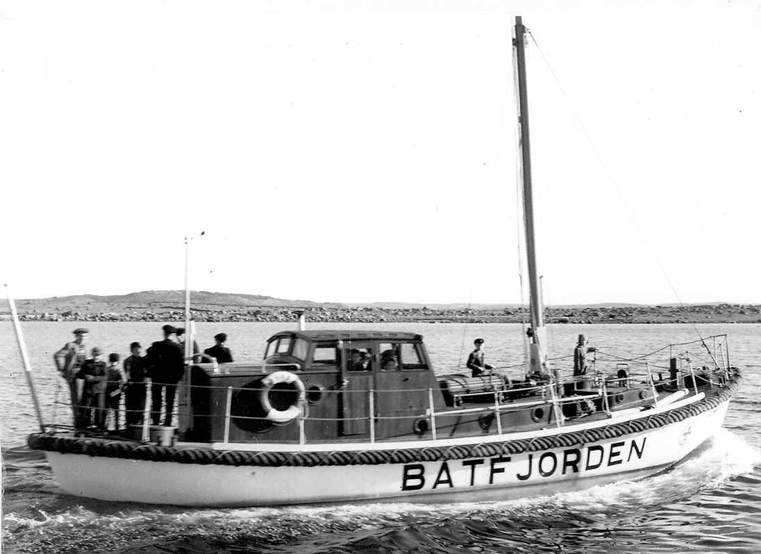 Livräddningsbåten "Gunnar Karlsson" på Båtfjorden 1947. Flera personer befinner sig ombord.