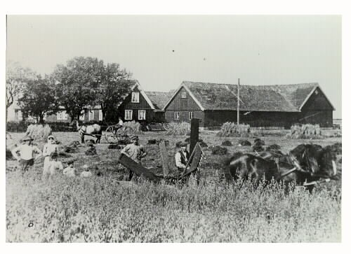 Skördearbete hos "Ryssens" i Olofsbo, Stafsinge. Havren skördas och binds till nekar som står på stubbåkern.