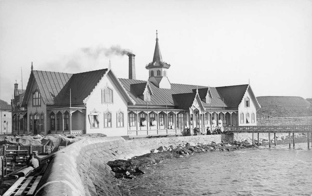Varmbadhuset i Varberg, uppfört 1866. Verandan till vänster är här öppen, jämför med bildnr F1669.