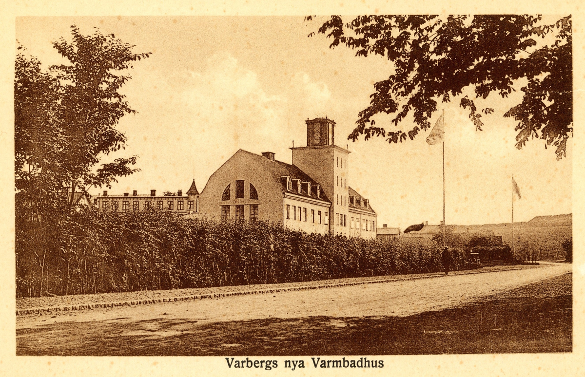Vykort, "Varbergs nya Varmbadhus", sett från nordöst längs Strandgatan. Jämför med bildnr F1672 från andra riktningen. Varmbadhuset invigdes 1925.