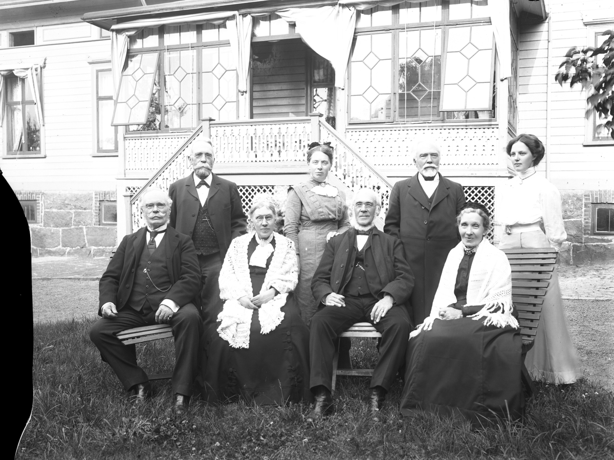 Prosten Magnus Ullman från Varberg med sällskap på gården Spekedal i Onsala. Han sitter som nummer två från höger på bänken. Bakom dem ses manbyggnadens glasveranda med ett par av fönstren uppställda. Det var Ullmans farfar och namne som 1812 köpte Spekedal 1:1 och bebyggde 1820. 1861 gick gården i arv till hans yngsta dotter och därefter vidare på kvinnosidan och eftersom de var gifta med sjökaptener har gården kommit att betraktas som en av Onsalas s k kaptensgårdar.
