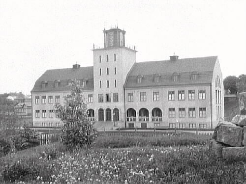 Varmbadhuset i Varberg vid Strandgatan längs Societetsparken, som ses i förgrunden. Kvarteret hette då Styrmannen men har uppgått i kv Skepparen. Badhuset invigdes 1925 och ersatte då det gamla som låg vid stranden mitt emot kallbadhuset.