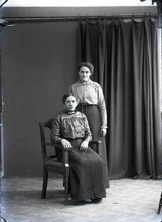 Falkenbergsateljén, två kvinnor i helfigur där en sitter. Beställare: Josefina Johansson. Fototid (osäker) 1910. (Se även GB2_6558)