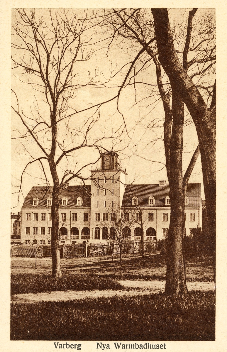 Vykort, "Varberg - Nya Warmbadhuset", invigt 1925. Badhuset ligger vid Strandgatan (fd kv Styrmannen) och ses från Societetsparken.
