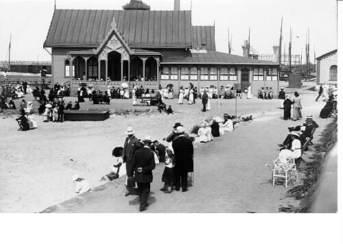Varmbadhusets södra fasad med veranda och tillbyggnad. Strandpromenaden. Barnens badstrand.