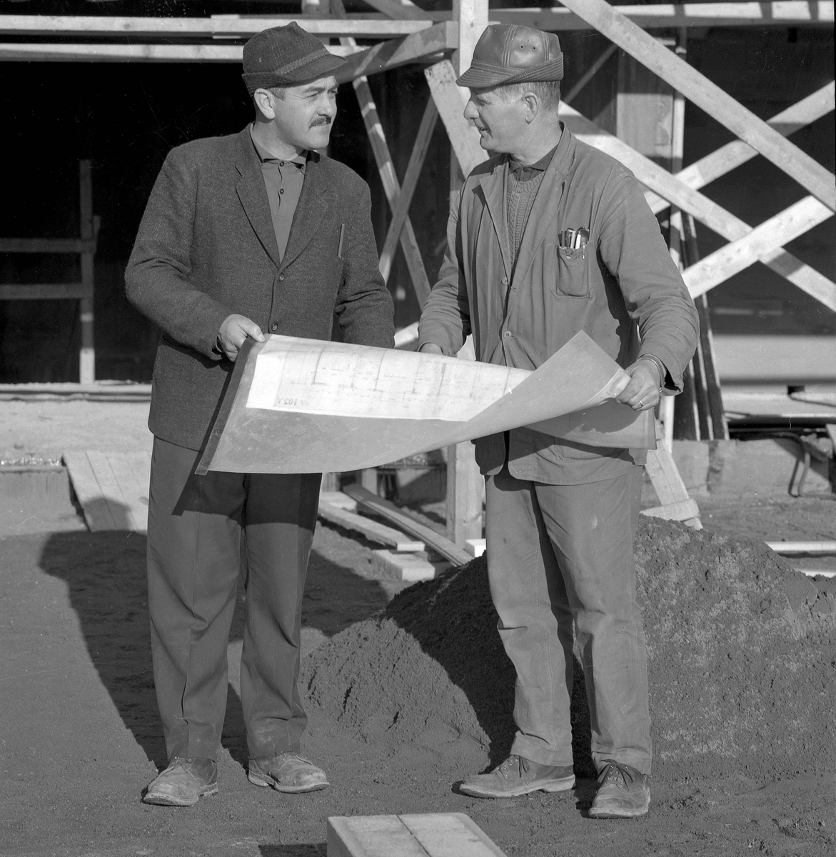 Två män står och läser en ritning på taket till köpcentret Rosen i Huskvarna.