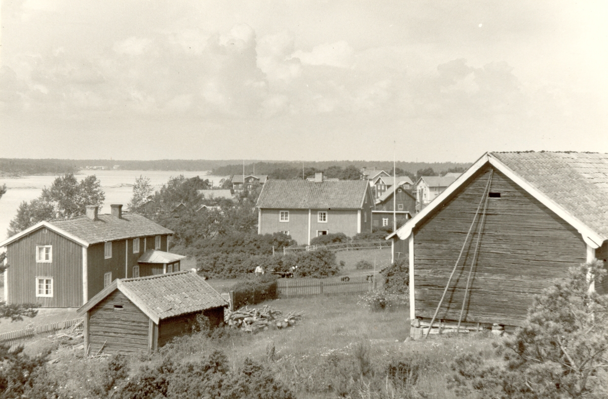 Byn Vinö sedd mot Klintemåla, som synes i bakgrunden. I förgrunden till vänster Thore Johanssons boningshus av parstugetyp. I mitten Richard Wigséns hus.