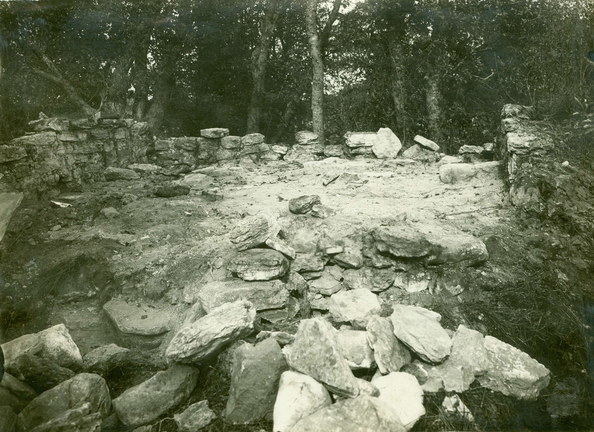 Gråborg, portens restaurering. Fyllning ovan porten avförd, varvid fragment av det forna porttornets gavlar framkommit.
