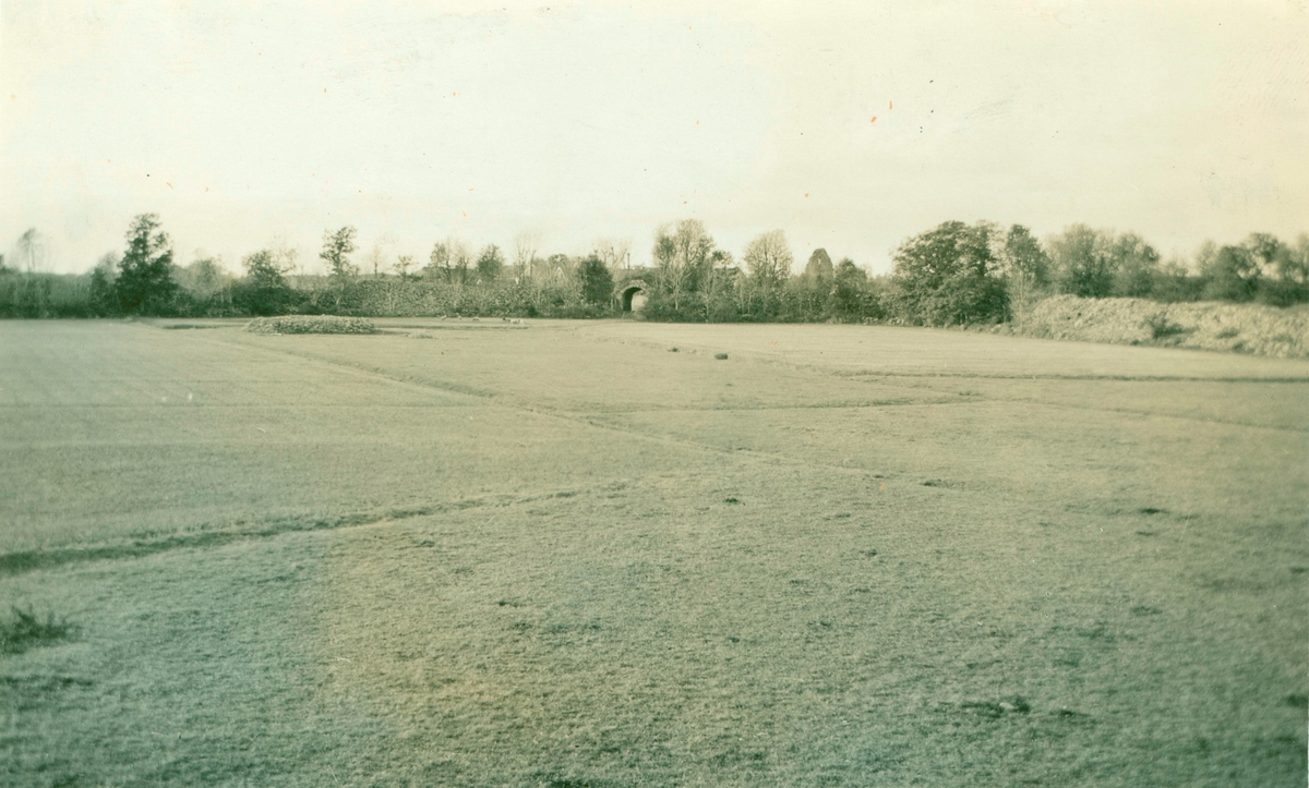 Bakom muren till höger om portlidret skymtar kapellruinens bevarade västra gavel.