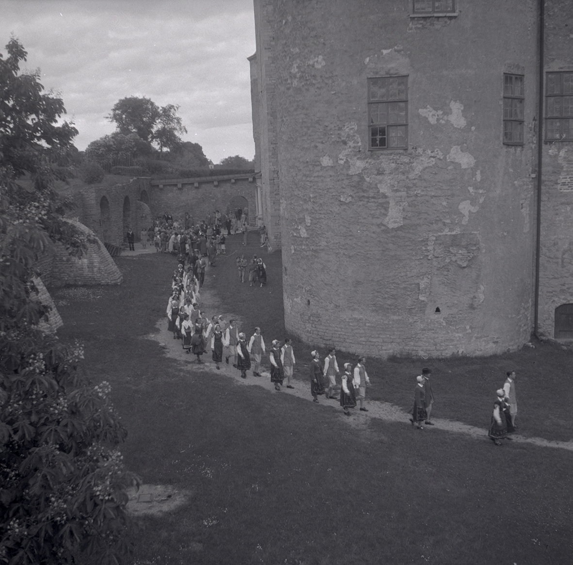 Människor som vandrar i folkdräkter på Kalmar slott. Orkester som spelar med violiner.