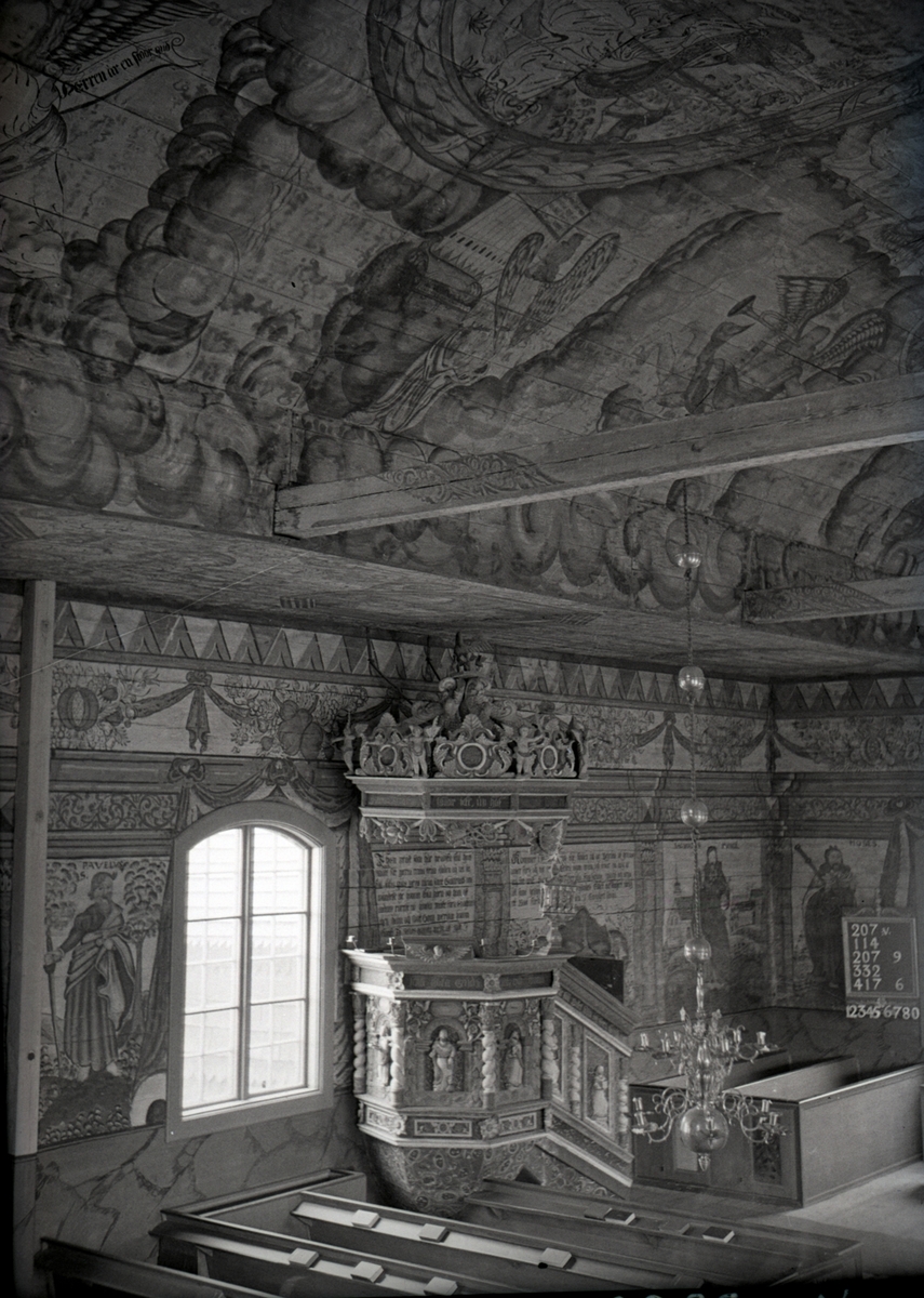 Titel: Djursdala kyrkas interiör mot predikstolen.