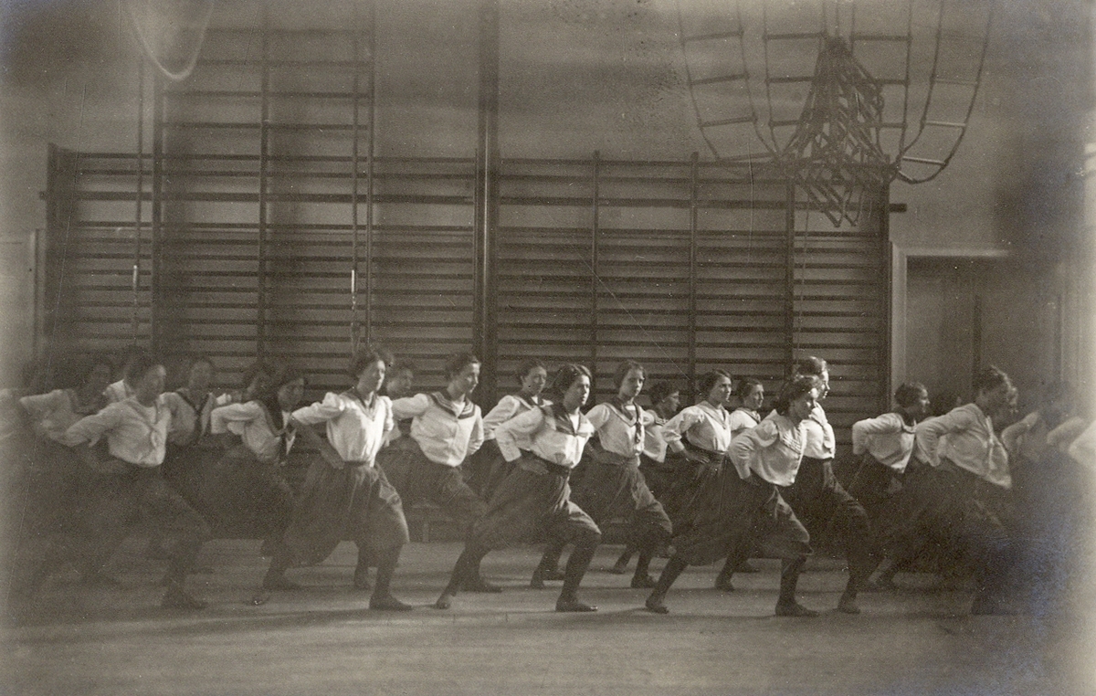 En grupp kvinnliga elever i gymnastiksalen på Ringsbergsskolan, Växjö, ca 1914.