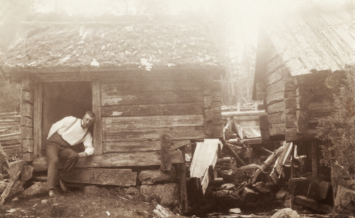 En man i skjortärmarna sitter i dörröppningen till en förfallen s.k. skvaltkvarn, 1914.