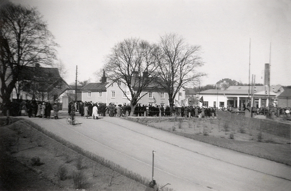 Medborgartåget, Växjö 1940, passerar Askelövsgatan vid nuvarande Oxtorget. I bakgrunden skymtar Ringsbergsskolan.
