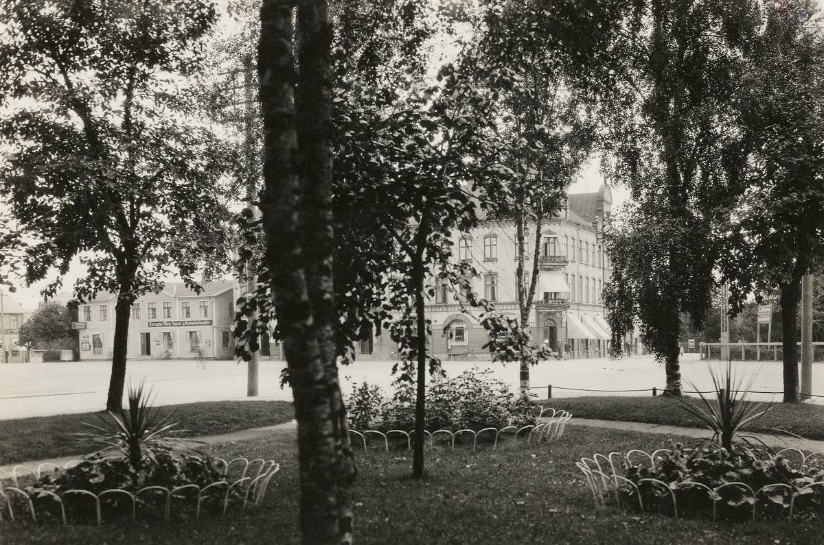 Järnvägsparken i Ljungby, 1925. Vy mot Stortorget (hörnet Storgatan/Stationsgatan).