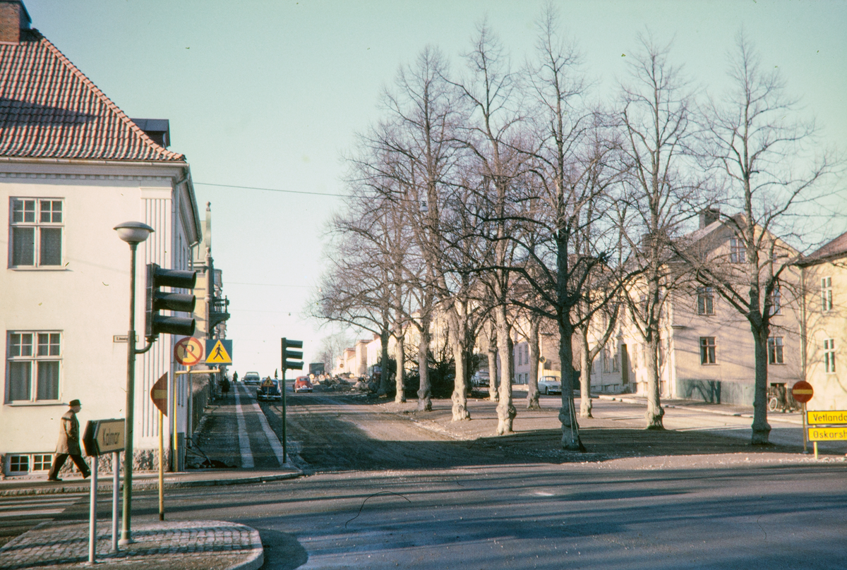 Norra Esplanaden västerut, i korsningen mot Linnégatan. Man håller på att ta ner de sista alléträden.