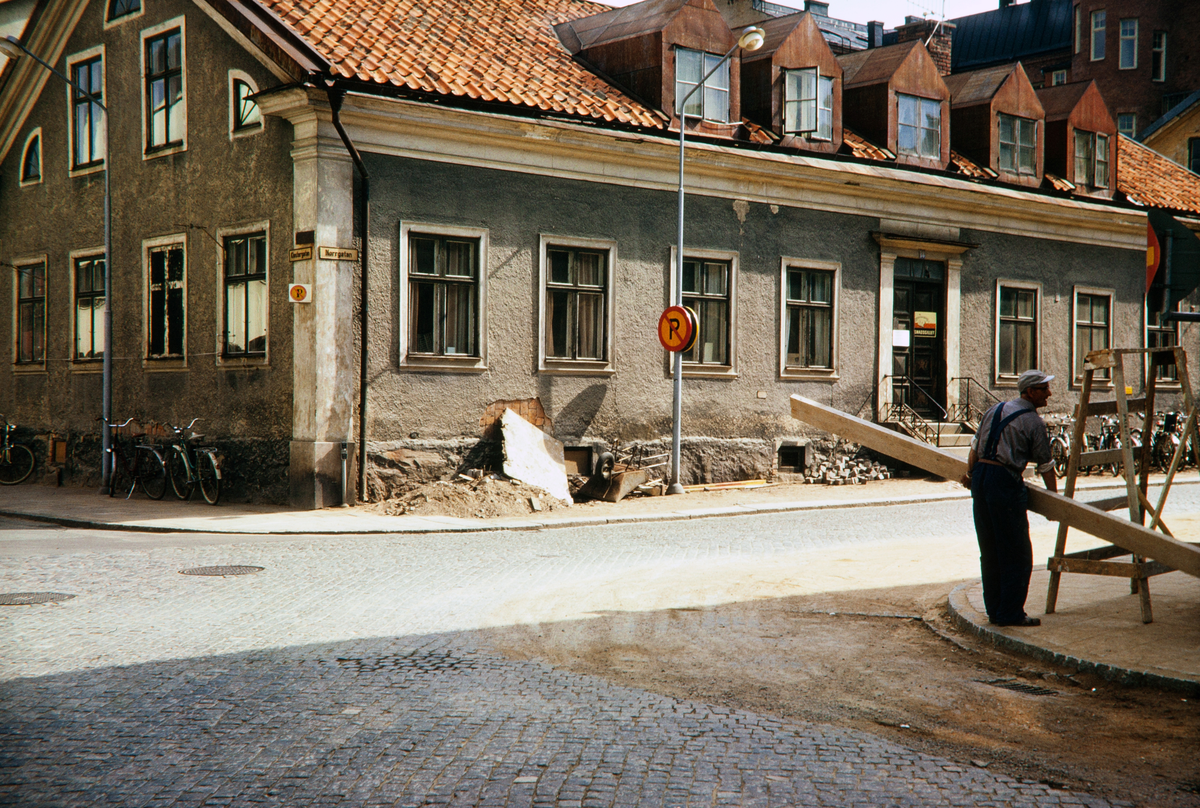 Hörnet Norrgatan/Klostergatan. En snickare håller på med en bräda på trottoaren.