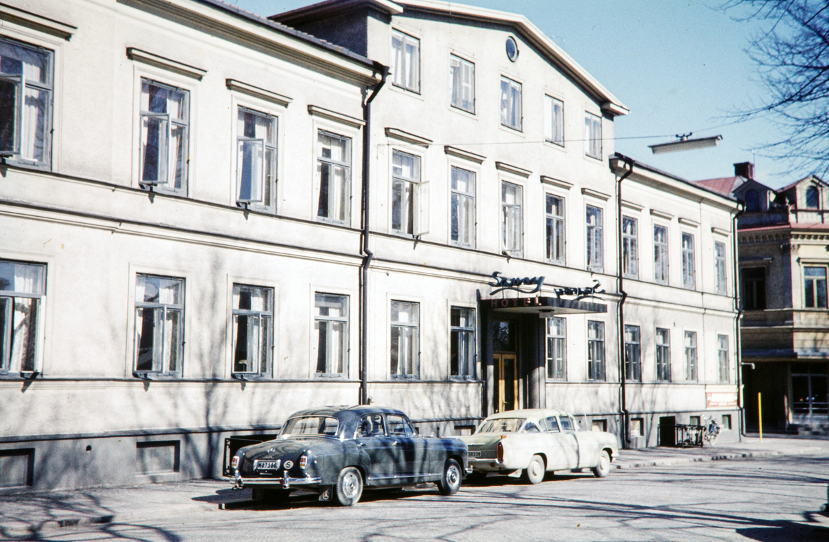 Hotell Savoy vid Norra Järnvägsgatan. I bakgrunden skymtar dåv. Spritbolagets hus i hörnan Norra Järnvägsgatan/Klostergatan.