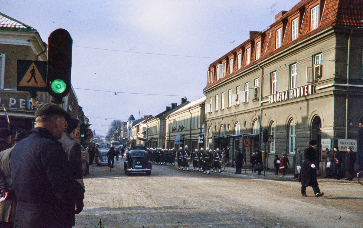 Storgatan i Växjö, vid den s.k. P.N. Perssons hörna (korsningen mot Kungsgatan). En militärorkester tågar fram.