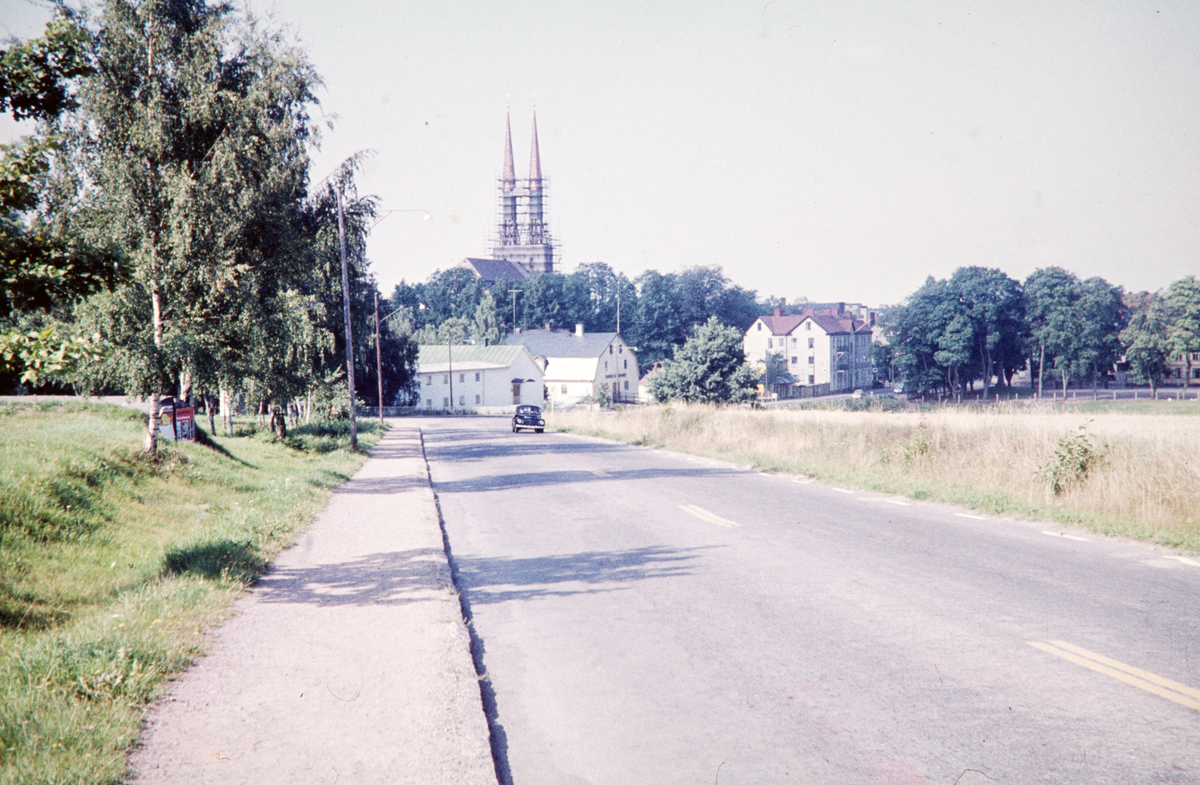 Utsikt från Risingevägen mot Sigfridshäll, Strykjärnet och domkyrkan (vars tornspiror håller att färdigställas).