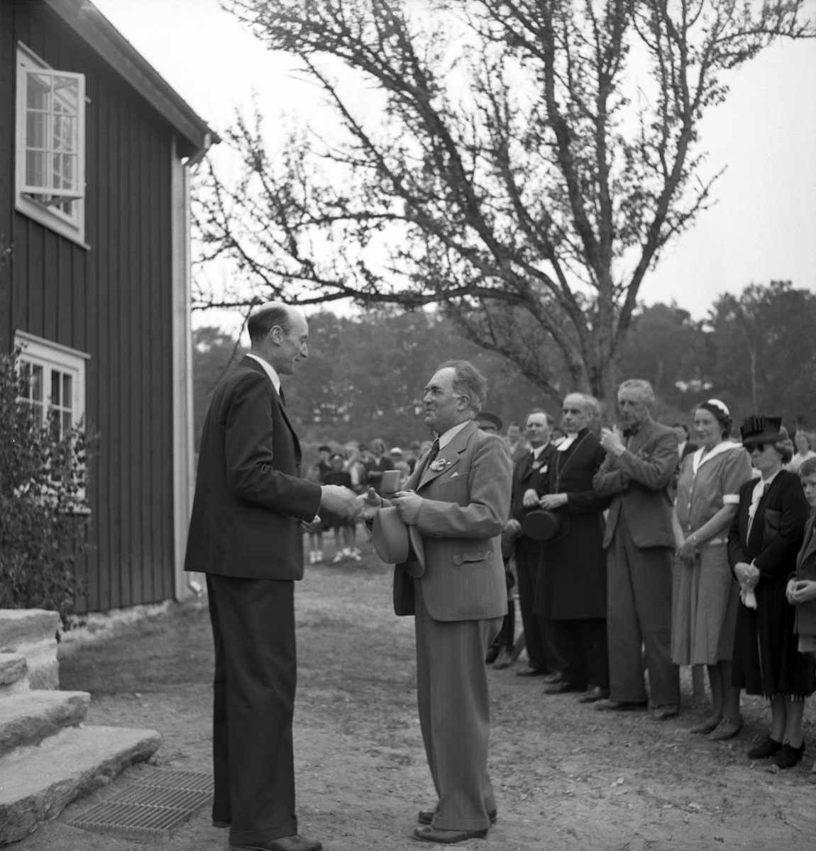 Skidfrämjandets dag. Fyllerydsstugan. Arkitekten m.m. Paul Boberg mottar medalj m.m. från en man i kostym.