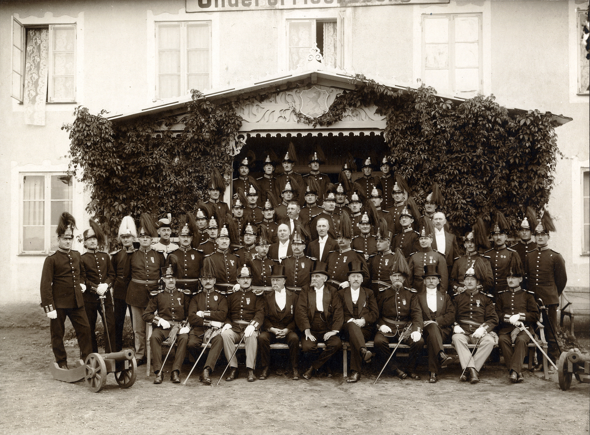 Gruppfoto av ett antal underofficerare och andra, flertalet i paraduniform med kask, men också en del i frack med hög hatt.