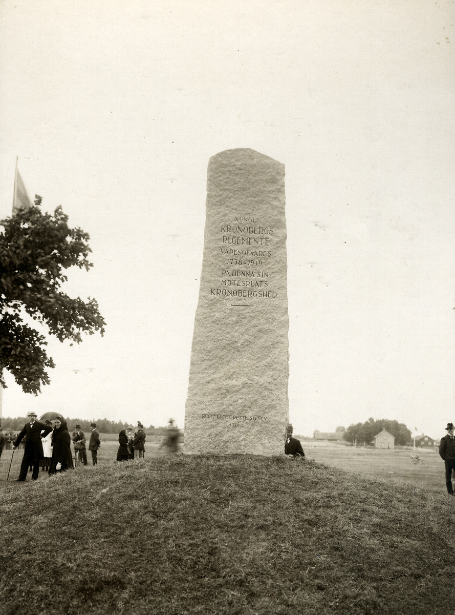 Foto av den stora, nyavtäckta minnesstenen på Kronobergs hed. En hel del folk har samlats för att inspektera det hela.