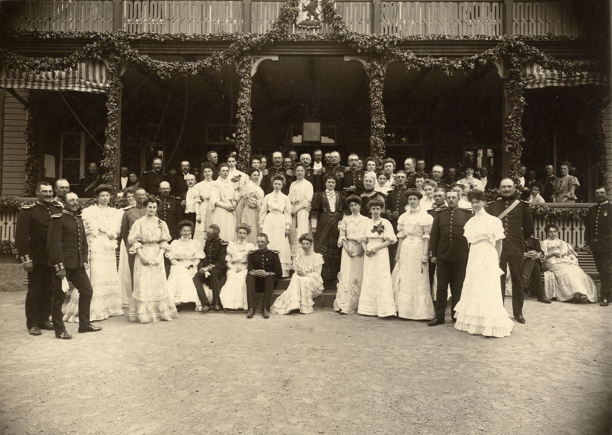 Gruppfoto av en samling herrar och damer, alla i festkläder (många av herrarna i uniform) framför officersmässen på Kronobergs hed.